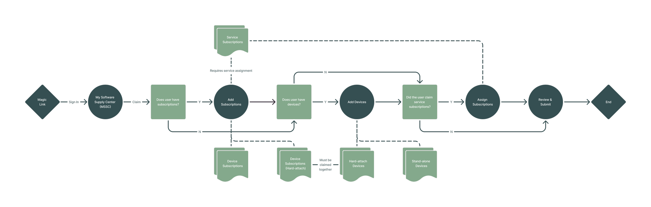 Before exploring individual interactions, I needed to test whether the full onboarding flow was even viable. The goal was to support any combination of onboarding elements, subscriptions, devices, and hard attach resources within a single, unified experience. To do that, I mapped out a high level flowchart showing how all pieces might work together. This helped me identify logical dependencies (e.g., certain subscriptions requiring device pairing), surface edge cases, and validate whether it was possible to consolidate these divergent onboarding paths into a single, adaptable wizard.